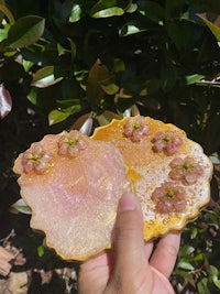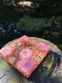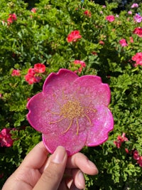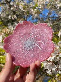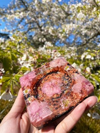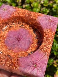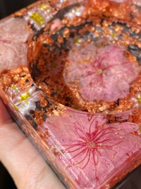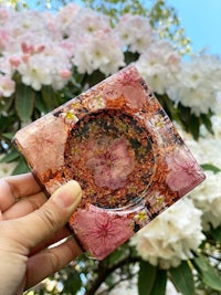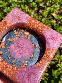 The Blooming Sakura Resin Ashtray is made with five real dried and pressed cherry blossom flowers! This large square ashtray has four indents on all sides to provide more use. The pearl black bottom allows the pink tones of the flowers and the rose gold tones of the flakes to really pop through! ✿