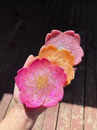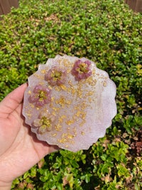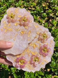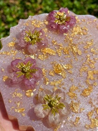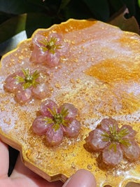 The Blooming Sakura Resin Coasters are poured with varying shades of light pink, gold, and pearl white. Gold flakes pool around the resin cherry blossom pieces. Each resin cherry blossom piece contains a real dried cherry blossom flower, and has hand painted gold accents emerging from the center. The hand painted gold rim of the coaster balances the piece! ✿
