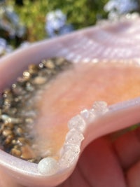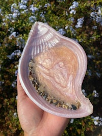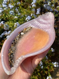 are made with resin, real sand, sea glass, and sea shell chips that are hand-gathered from local Bay Area beaches! The dish features a sandy sea shore that meets sunset peach waves, and the waves can be seen glittering an antique gold. This beachy sunset setting sits within a pearl lilac medium conch shell dish. My final touch is the rim of the conch, which is embellished with decorative resin pieces!