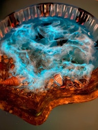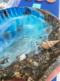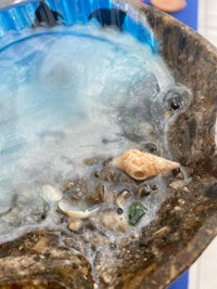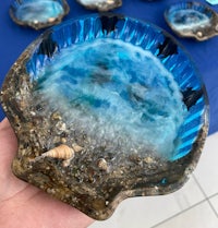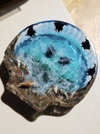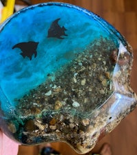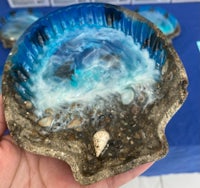 are made with resin, real sand, shells, sea glass, and sea shell chips that are hand-gathered from local Bay Area beaches! Each dish contains fish shadows that can be seen throughout the turquoise ocean. The top of the dish features a sandy sea shore that includes a variation of shells, rocks, and sea glass pieces. The shore is hugged by glittery white waves, that glow a blue/aqua tone when in the dark! Inspired by bioluminescence that naturally occurs in our oceans.